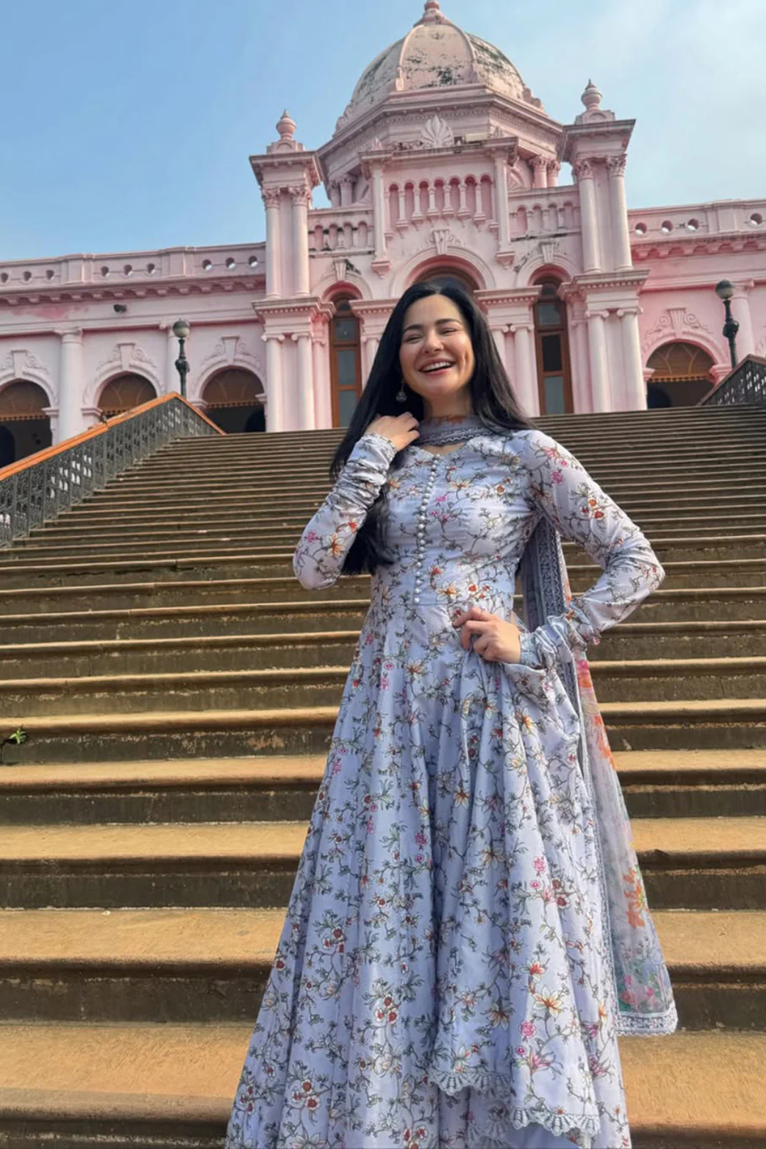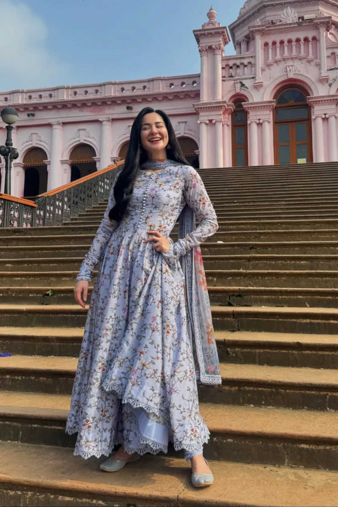Meticulously crafted in luxurious silk, Ataliah embodies a printed and embroidered pishwas showcasing timeless elegance with every detail. Paired with a sleek silk churidaar for a refined finish, the ensemble is elevated with a buttersoft chiffon dupatta, adding textual intrigue. A perfect fusion of tradition and modern grace, this look is designed to make every moment feel regal.