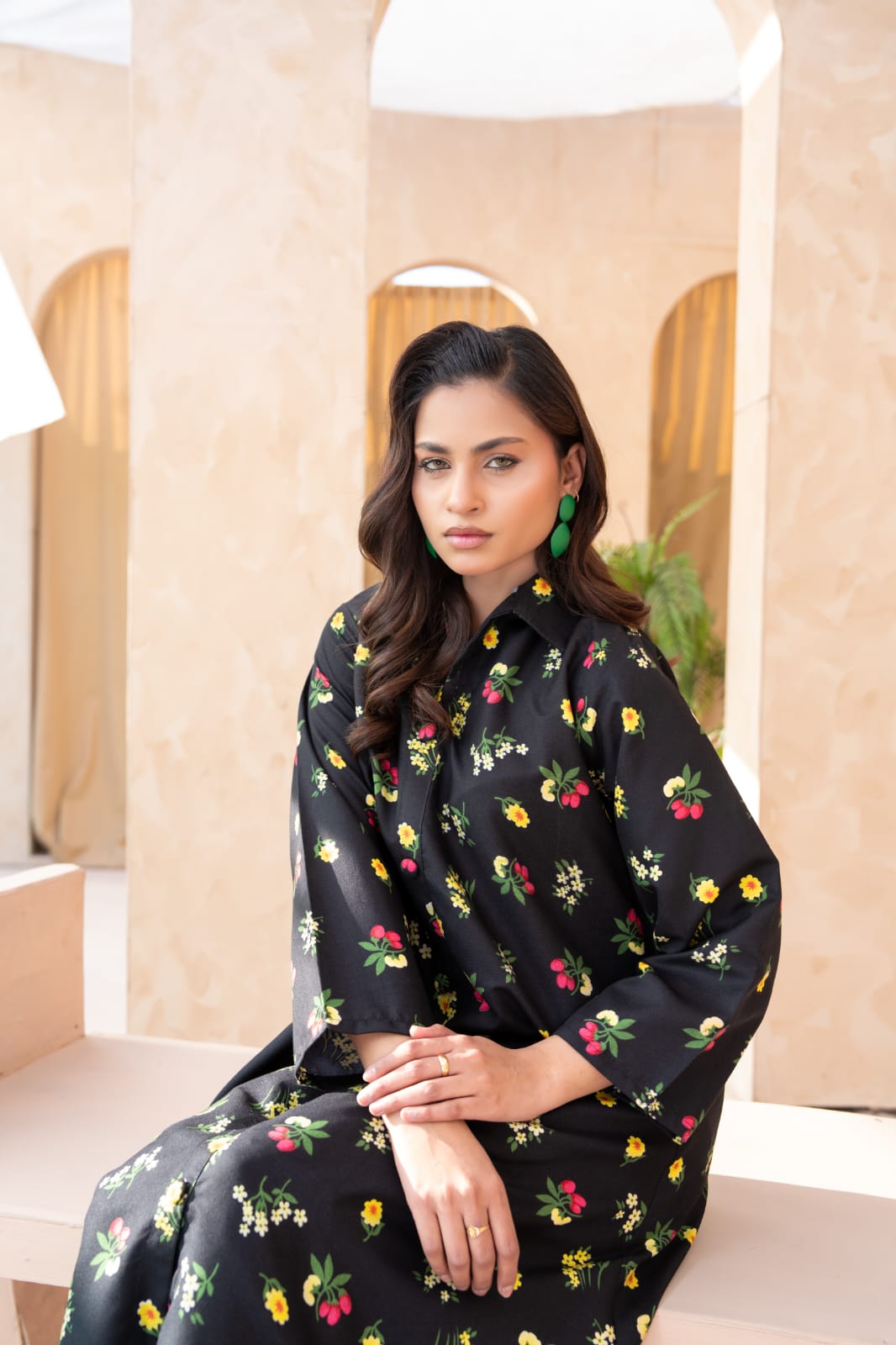 This exquisite Flared Pishwas set is a must-have for your winter wardrobe. Crafted from luxurious Twill Cotton in classic black, the top features intricate Rotary Printed details. The 2-piece ensemble includes a beautifully lined top and bottom, perfect for the season. Elevate your style with this stunning piece from MARYAMB.