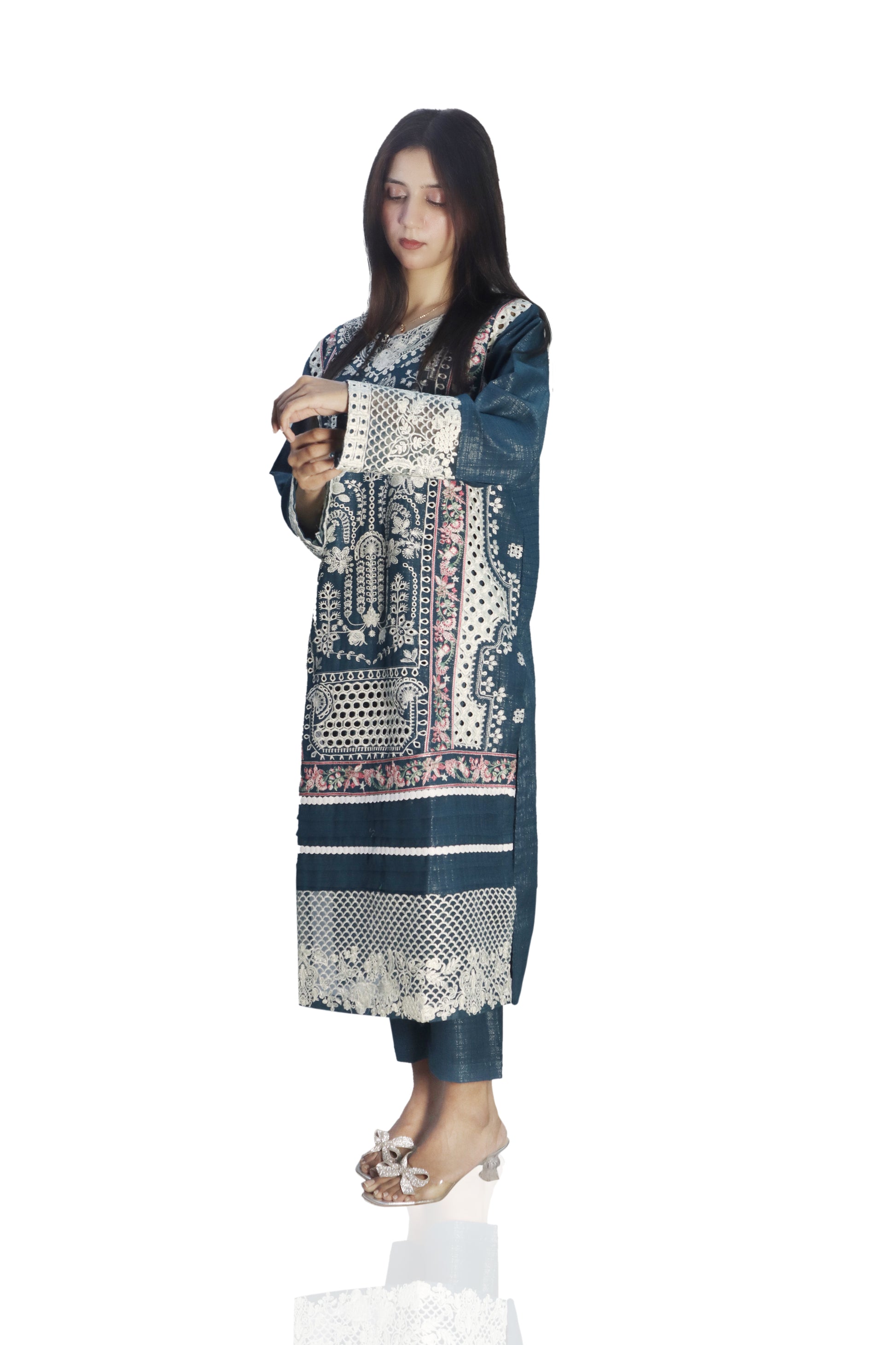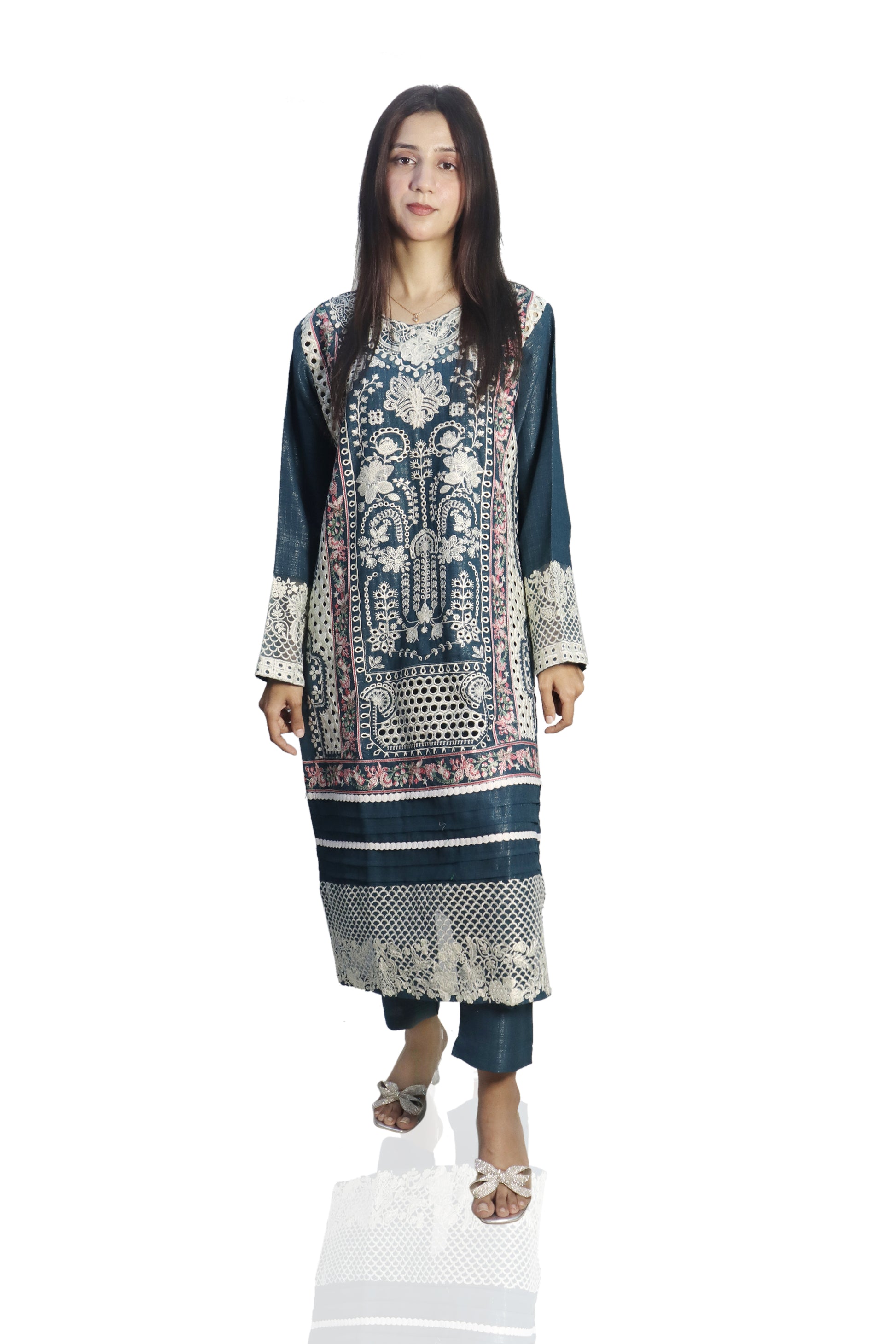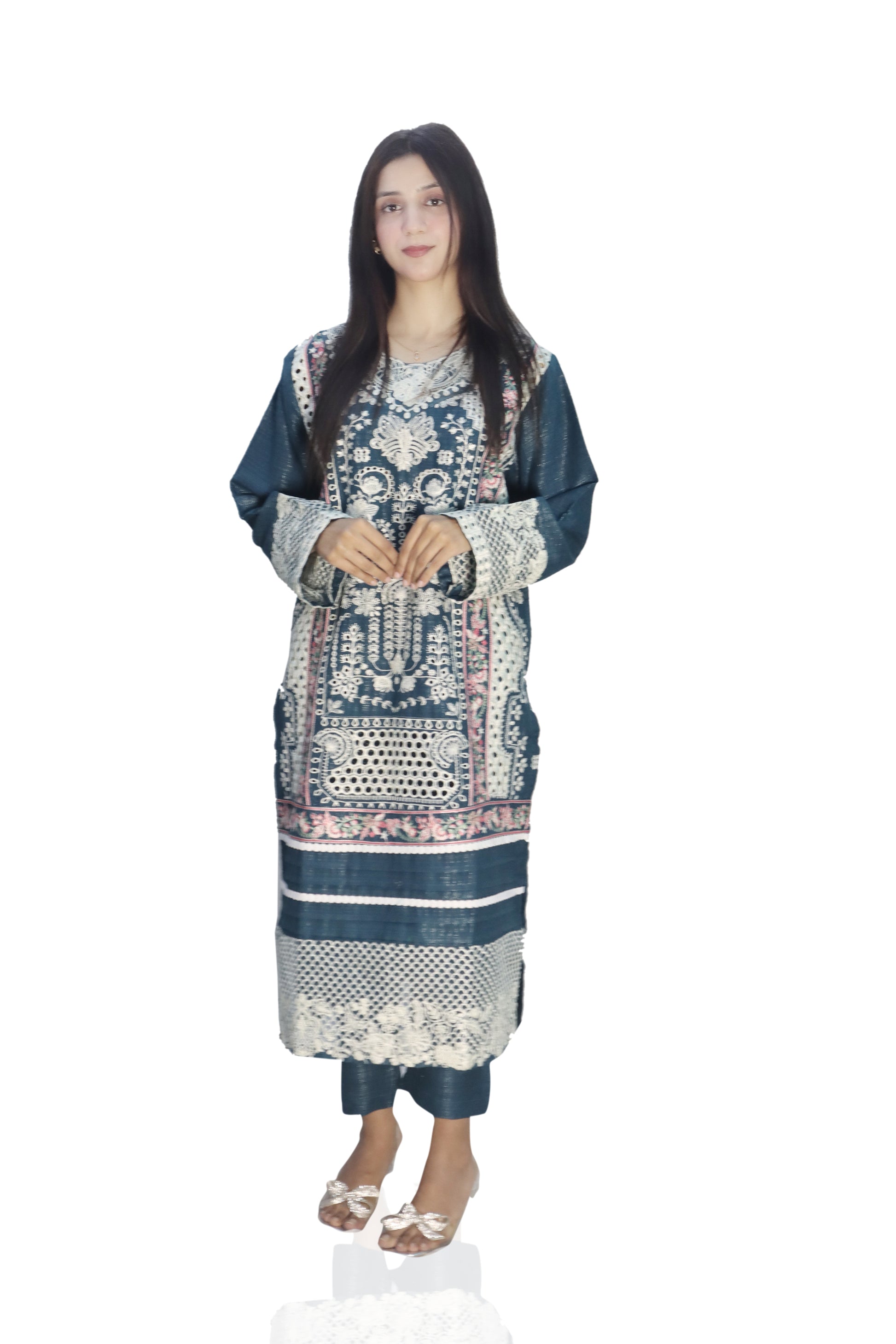 A winter season 2-piece fully embroidered set typically features intricate designs that evoke the beauty of the colder months. The set usually includes a long tunic, matching trousers, and a shawl or dupatta, all adorned with detailed embroidery that may include floral patterns, snowflakes, or winter motifs.