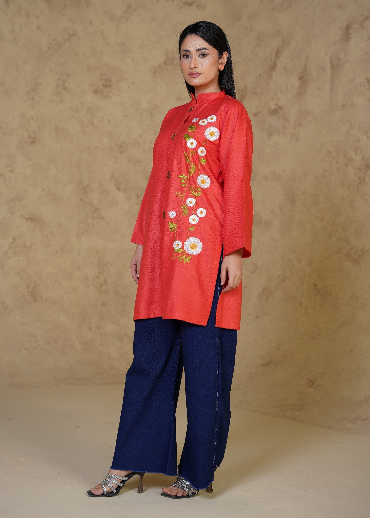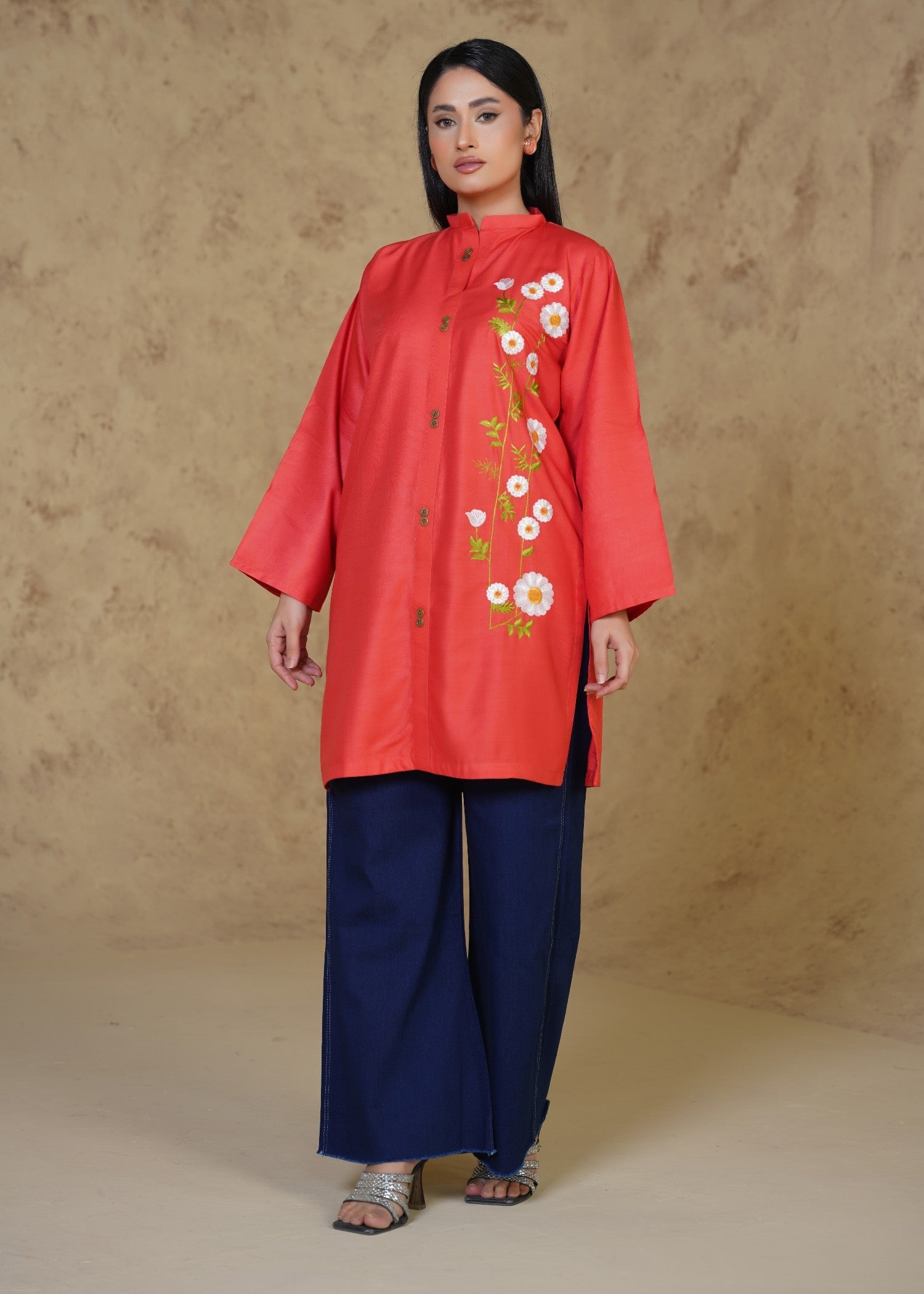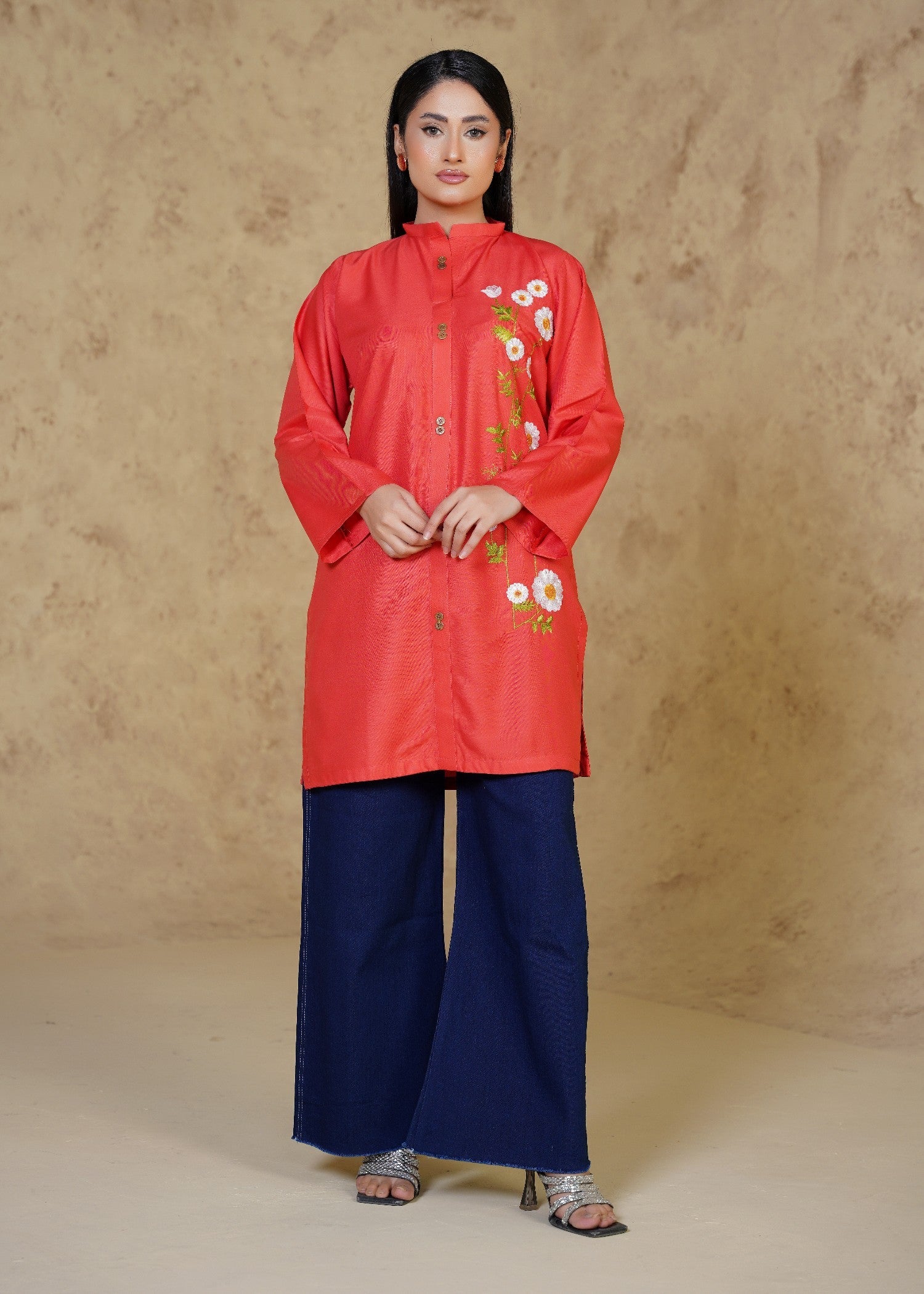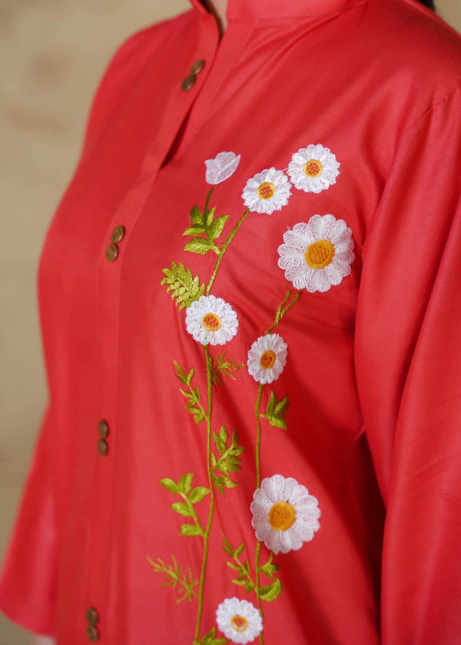 - Design: The top features eye-catching floral EMBROIDERY detailing running vertically down the front, adding a charming, feminine touch. The band collar and front button placket complete the chic look.